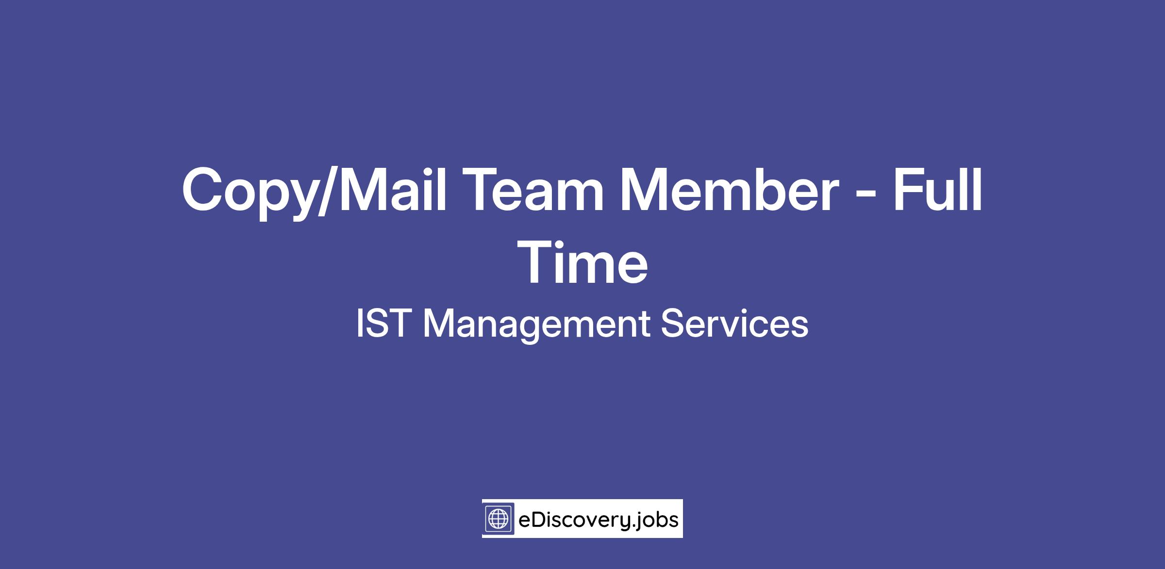 Consider a new career today as a Full Time, Copy/Mail Team Member with IST Management Services, the fastest-growing, national, facilities management company in the industry. IST Management is a BPO Company (Business Process Outsourcing) specializing in providing solutions for the management of physical and digital information through Facilities Management, eDiscovery, and Electronic Document Management services.