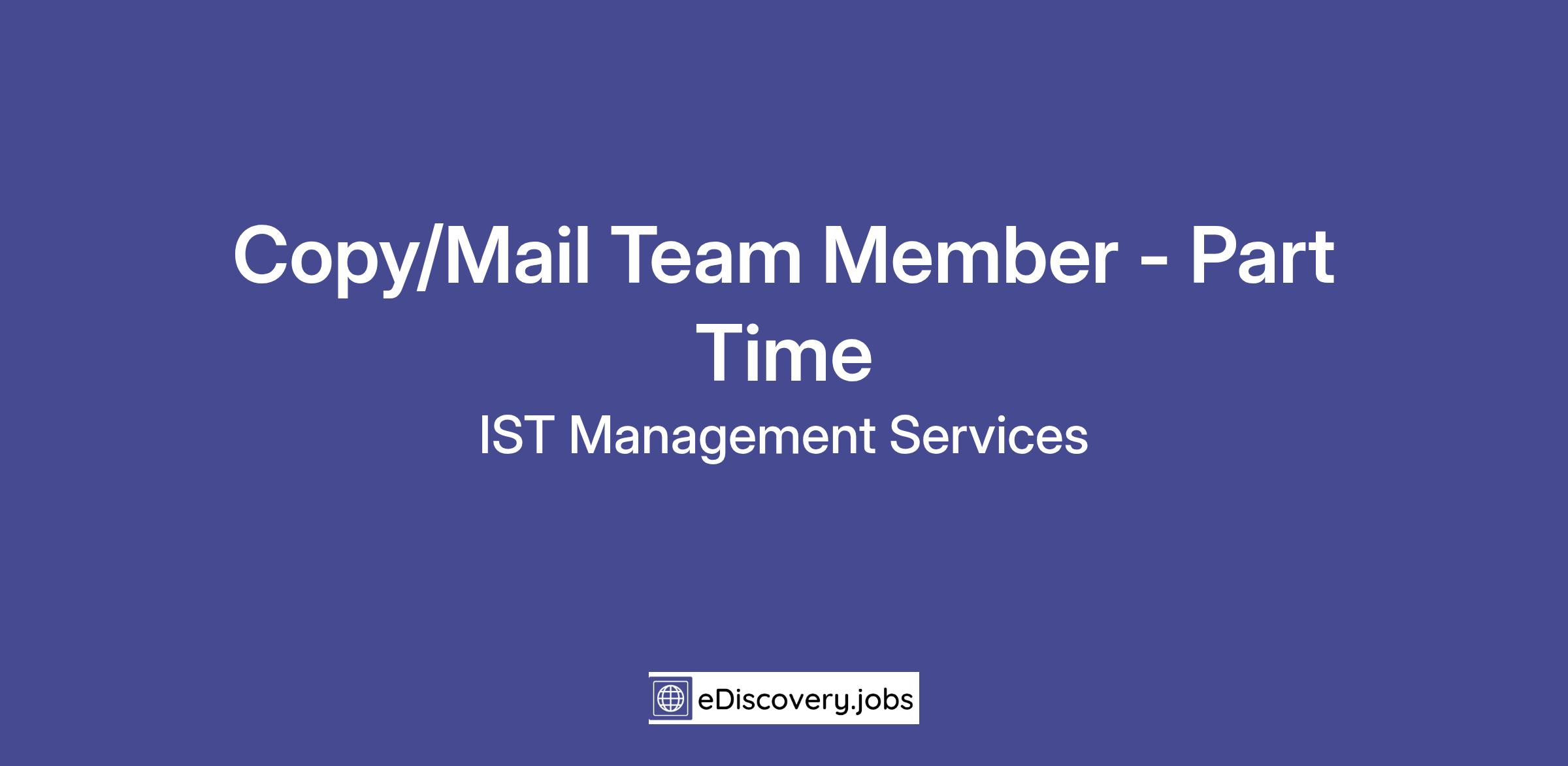 Consider a new career today as a Copy/Mail Team Member- Part-Time with IST Management Services, the fastest-growing, national, facilities management company in the industry. IST Management is a BPO Company (Business Process Outsourcing) specializing in providing solutions for the management of physical and digital information through Facilities Management, eDiscovery, and Electronic Document Management services.