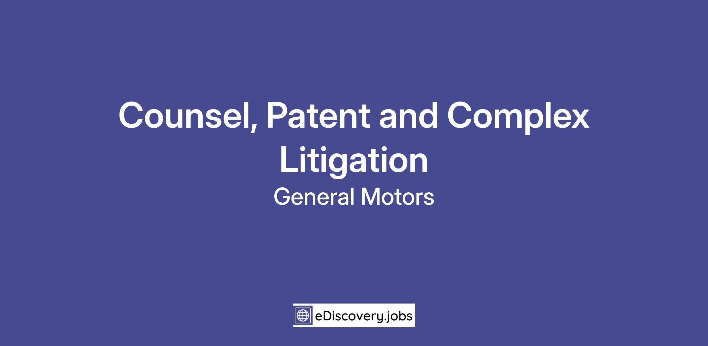 The title of the position is Counsel, Patent and Complex Litigation. The position is part of the Complex Litigation group on the GM Legal Staff. We anticipate the attorney hired for this position will have four primary areas of responsibility: