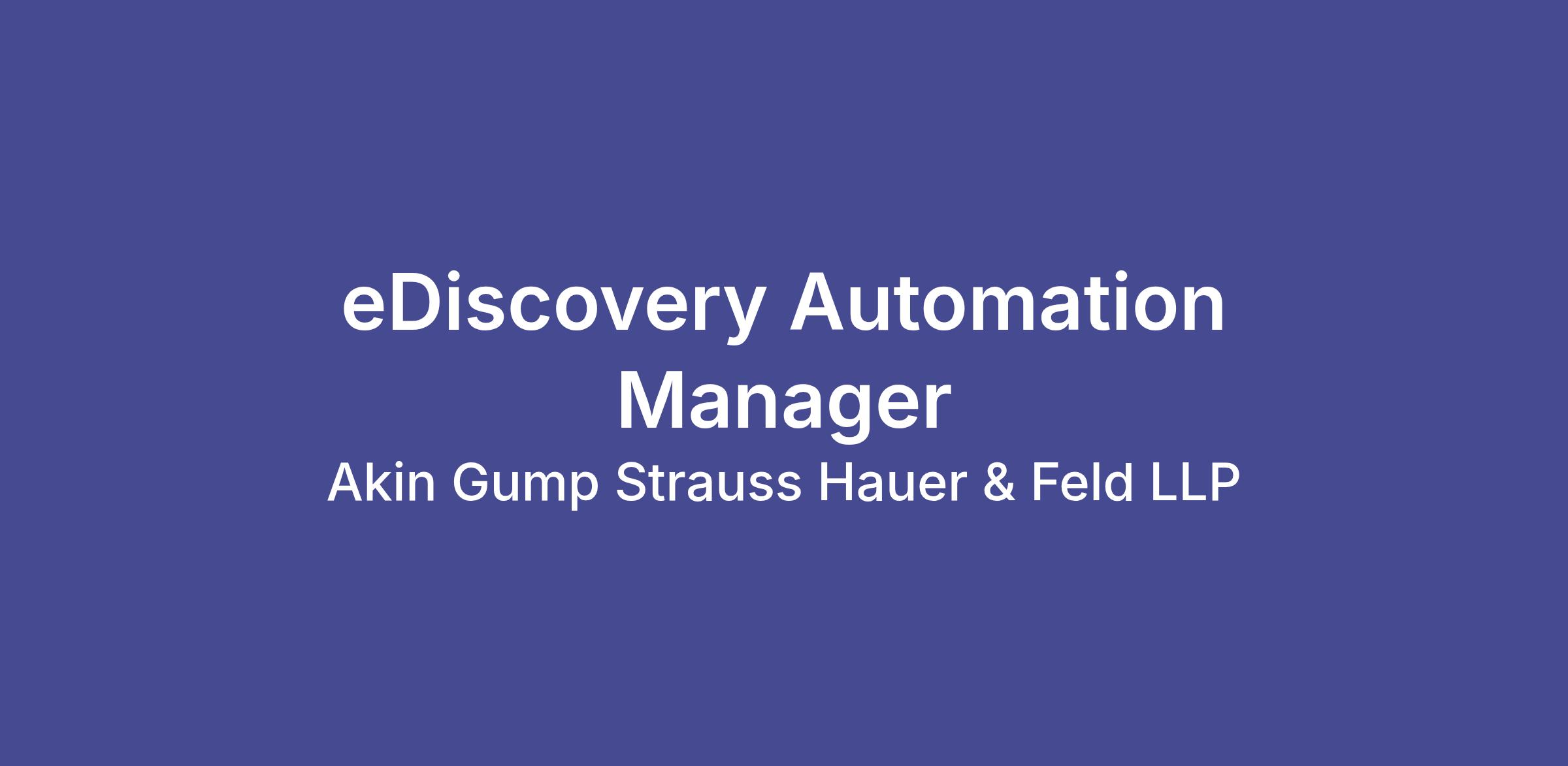 Akin Gump Strauss Hauer & Feld LLP is a leading international law firm with more than 900 lawyers in offices throughout the United States, Europe, Asia and the Middle East. We are currently seeking a eDiscovery Automation Manager in the eDiscovery department, reporting to the Director of eDiscovery.
