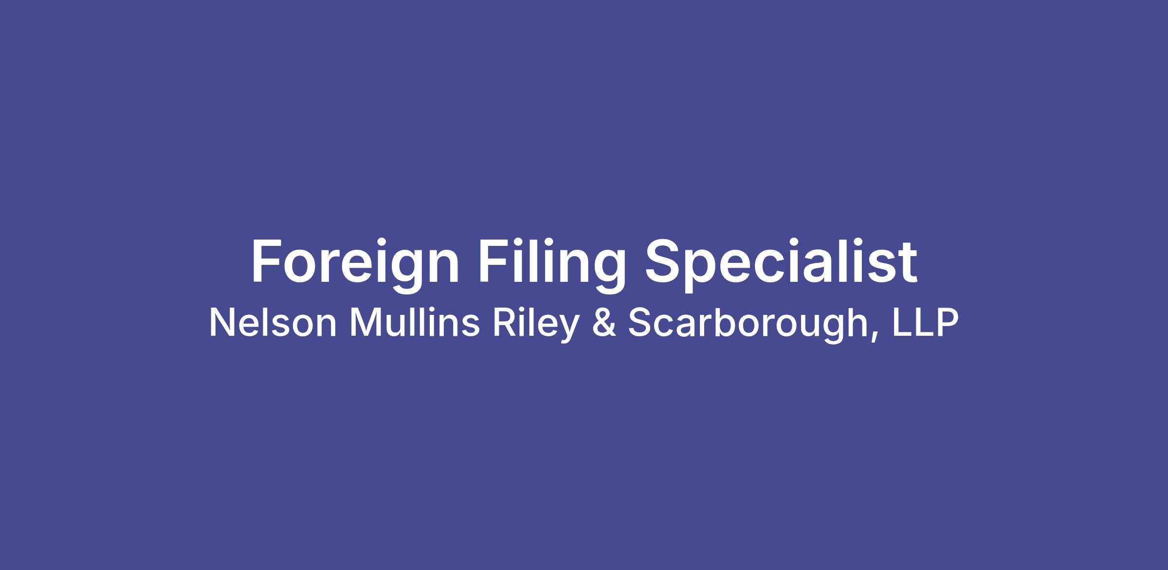Nelson Mullins, an AmLaw 60 firm, is seeking a Foreign Filing Specialist to support its Intellectual Property group, performing a variety of foreign patent prosecution-related tasks. This position reports to the Foreign Filing Supervisor as a member of the Foreign Filing Department. The Foreign Filing Specialist will be responsible for all foreign filing and formalities throughout prosecution, including independent management of client dockets and foreign patent prosecution requirements. The department is seeking a motivated candidate who is interested in continued learning and professional development and in assuming increased department responsibilities over time.