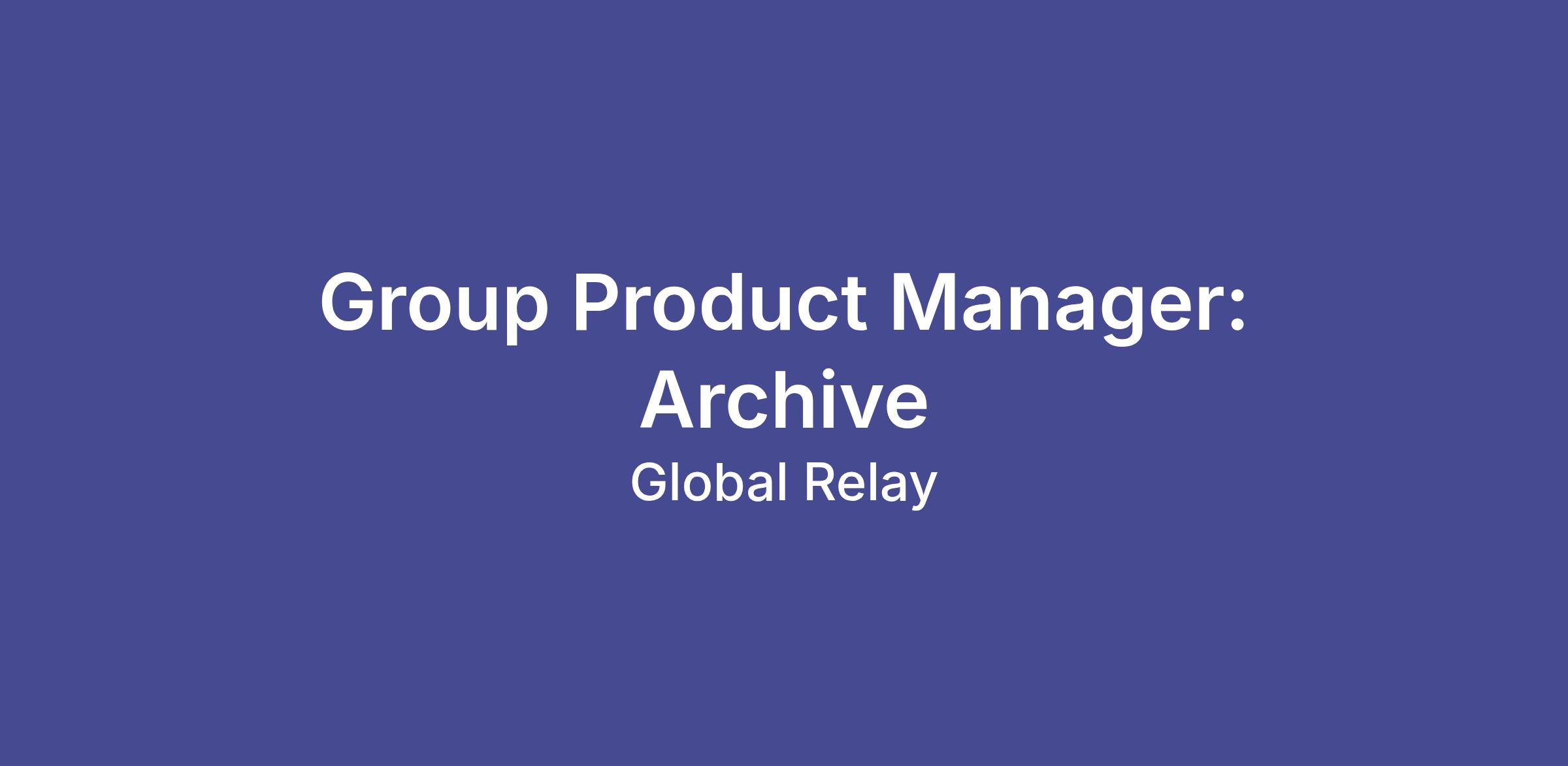 Global Relay requires a product management leader to drive significant new capabilities for our Archive product portfolio. The Group Product Manager (GPM) assumes product ownership of several critical experiences within the Global Relay Archive product line and is responsible for managing and evangelizing their product strategy, driving product innovation and excellence within their teams, working with clients and across the business to discover, define and develop differentiating customer led products and capabilities. This role will focus on our core backend platform and its services to manage enterprise data into the Archive, enable capabilities for compliance and eDiscovery, and unlock the power of AI and machine learning models. Your success will provide direct impact and value to our enterprise clients from many industries including finance, insurance, healthcare, & energy.