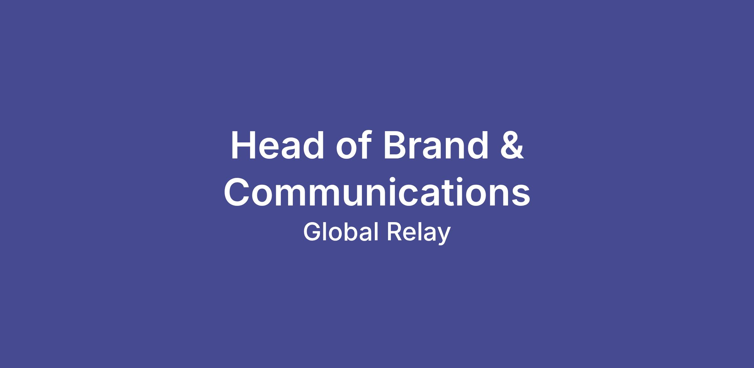 Global Relay is seeking a Head of Brand and Communications, who will be responsible for driving the brand and communications strategy across internal and external audiences.