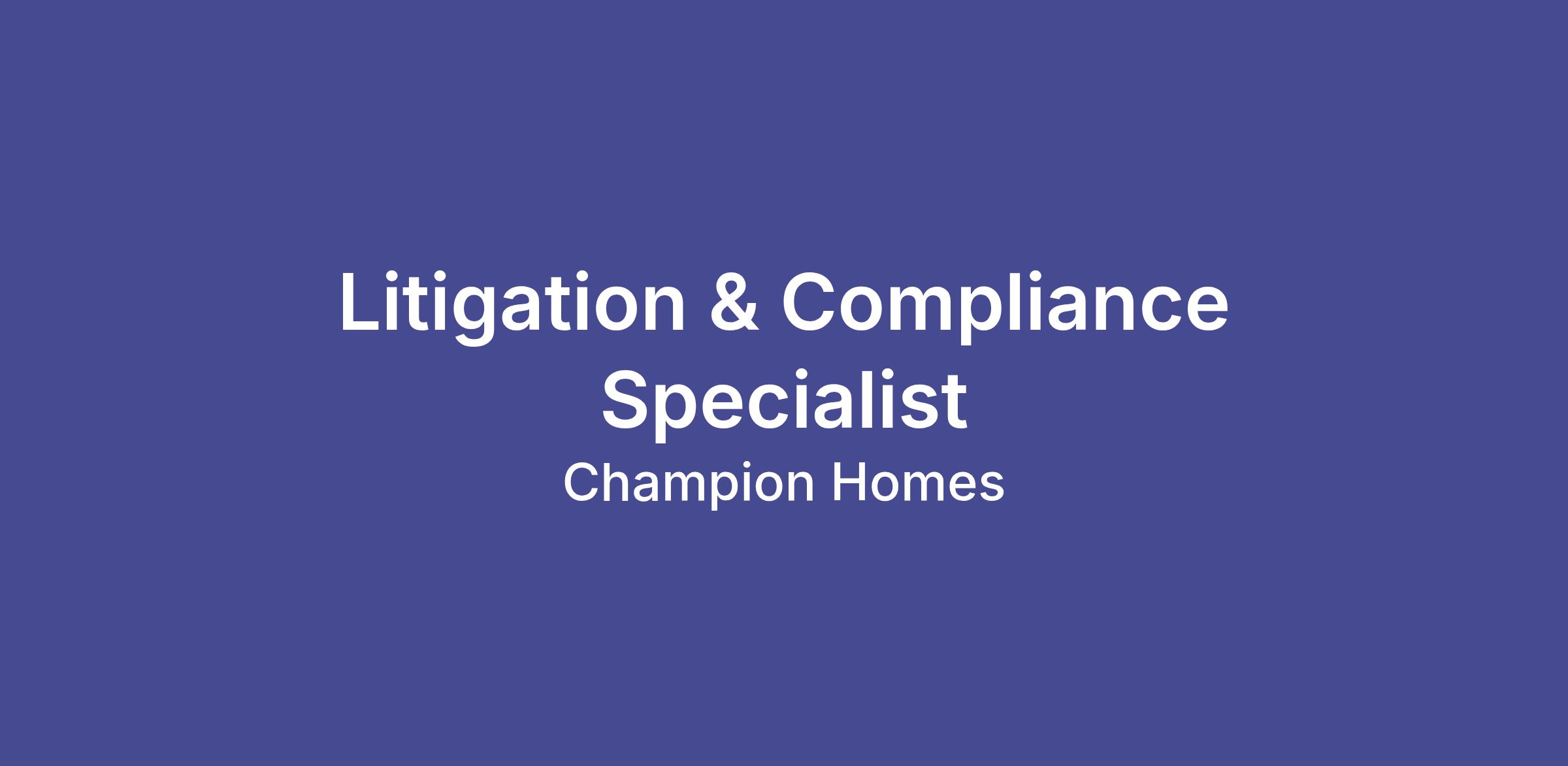 Champion Home Builder, Inc wants YOU! We are seeking to hire a Litigation & Compliance Specialist to join our team in the Troy, MI region.