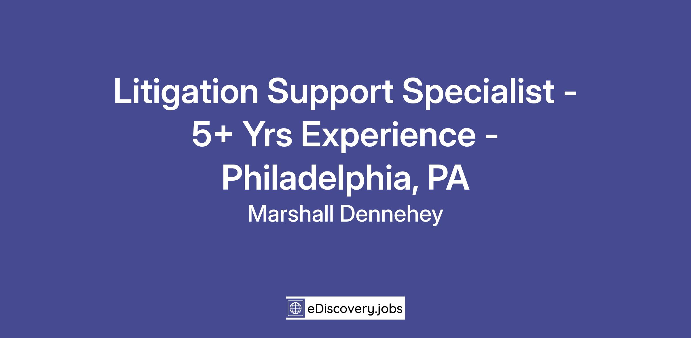 The law firm of Marshall Dennehey seeks a full time Litigation Support Specialist with 5+ years of experience for its Philadelphia, PA office.
