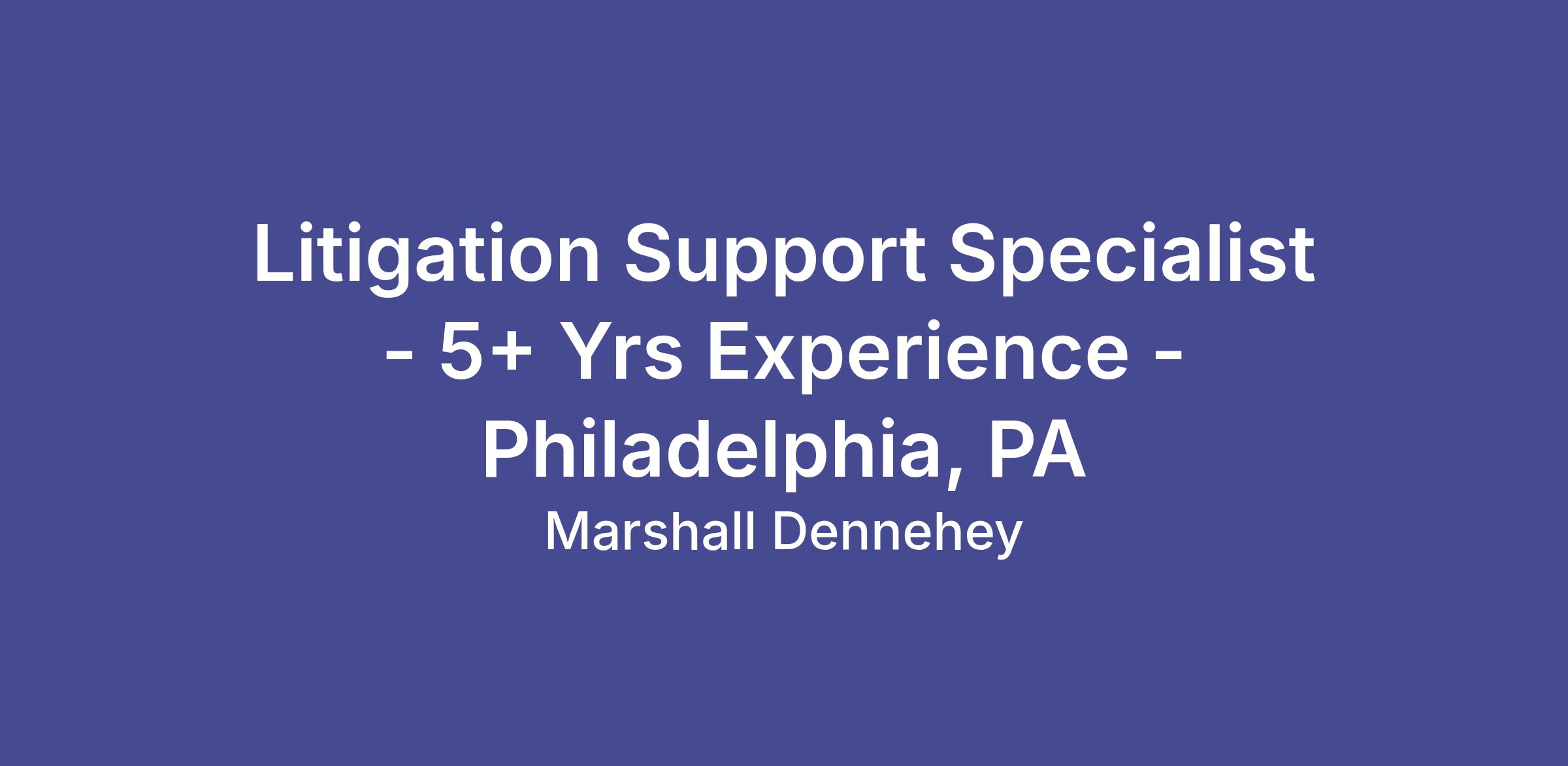 The law firm of Marshall Dennehey seeks a full time Litigation Support Specialist with 5+ years of experience for its Philadelphia, PA office.