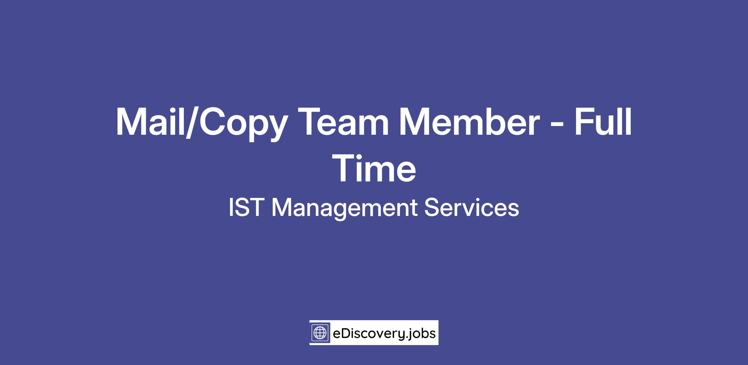 Consider a new career today as a Mail/Copy Team Member - Full Time with IST Management Services, the fastest-growing, national, facilities management company in the industry. IST Management is a BPO Company (Business Process Outsourcing) specializing in providing solutions for the management of physical and digital information through Facilities Management, eDiscovery, and Electronic Document Management services.