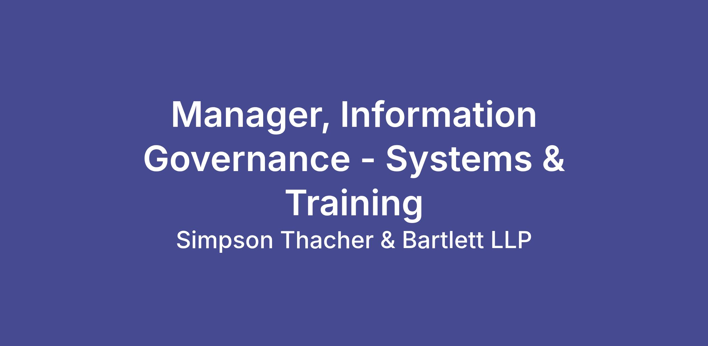 The Manager, Information Governance - Systems & Training advances Simpson Thacher & Bartlett’s information governance (“IG”) strategy by implementing and optimizing technology solutions, driving user adoption, and leading firmwide IG change management. Reporting to the Director of Information Governance (Office of the General Counsel), this role ensures electronic records and systems are integrated, secure, and compliant with legal, regulatory, and professional standards.