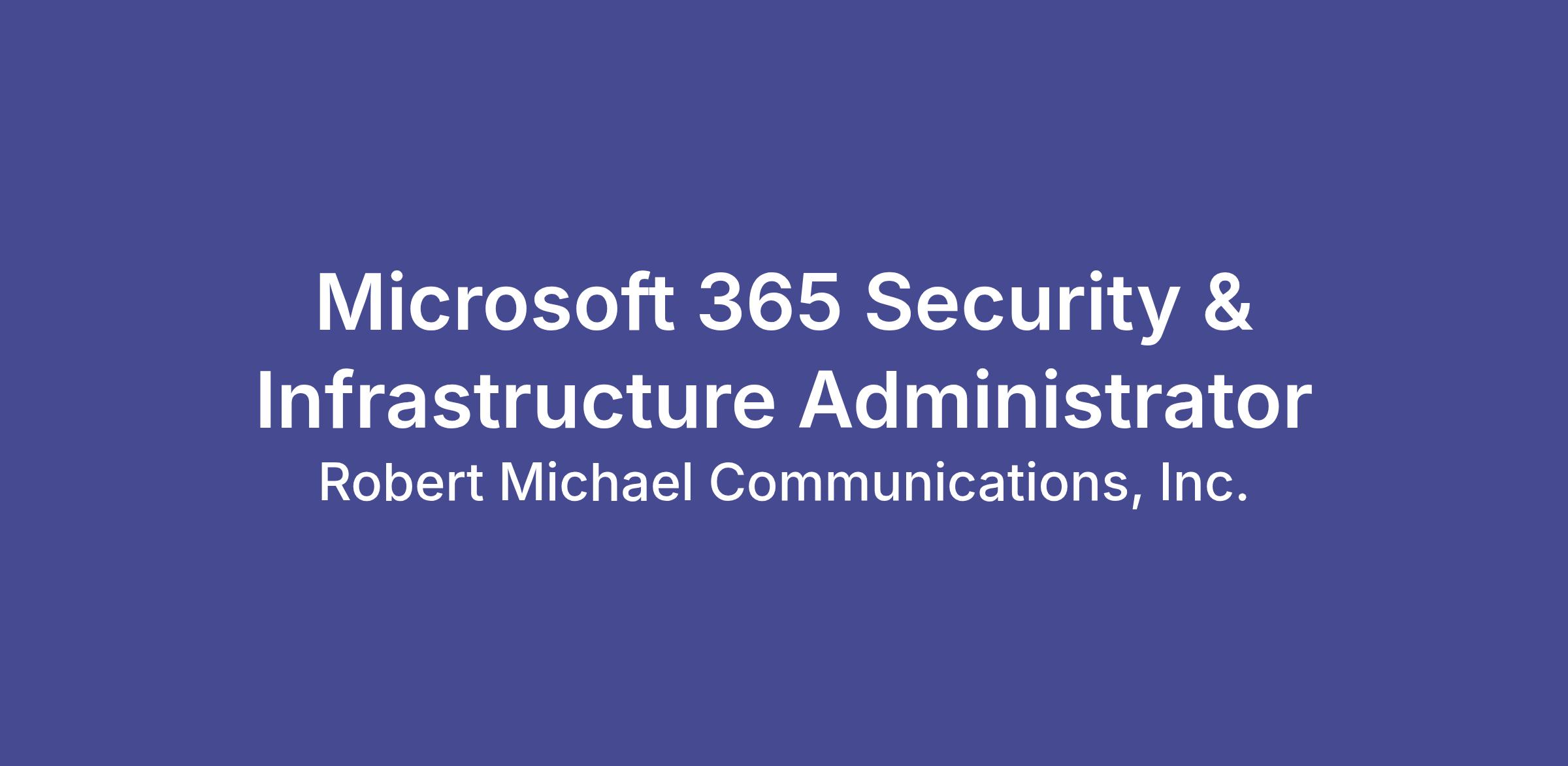Robert Michael Communications, Inc. is seeking an experienced Microsoft 365 Security & Infrastructure Administrator to lead the day-to-day configuration, security, and operational integrity of our Microsoft 365 environment. This is a hands-on role focuses on identity protection, tenant hardening, and enforcing security best practices across Microsoft cloud services.