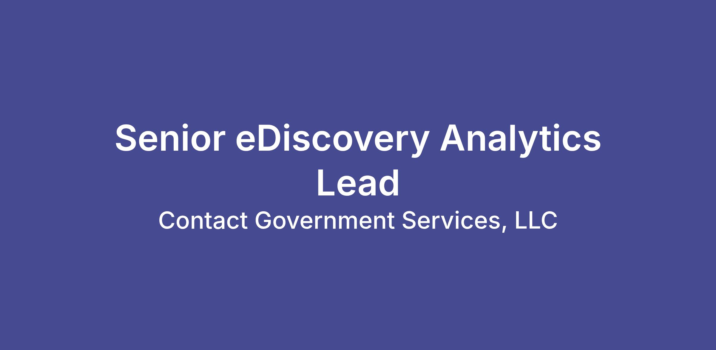 As a Senior eDiscovery Analytics Lead for Contact Government Services, you will be using your legal experience to aid a large federal agency in achieving its mission. You will be providing electronic discovery technical support and assisting with strategic and legal aspects using Relativity.