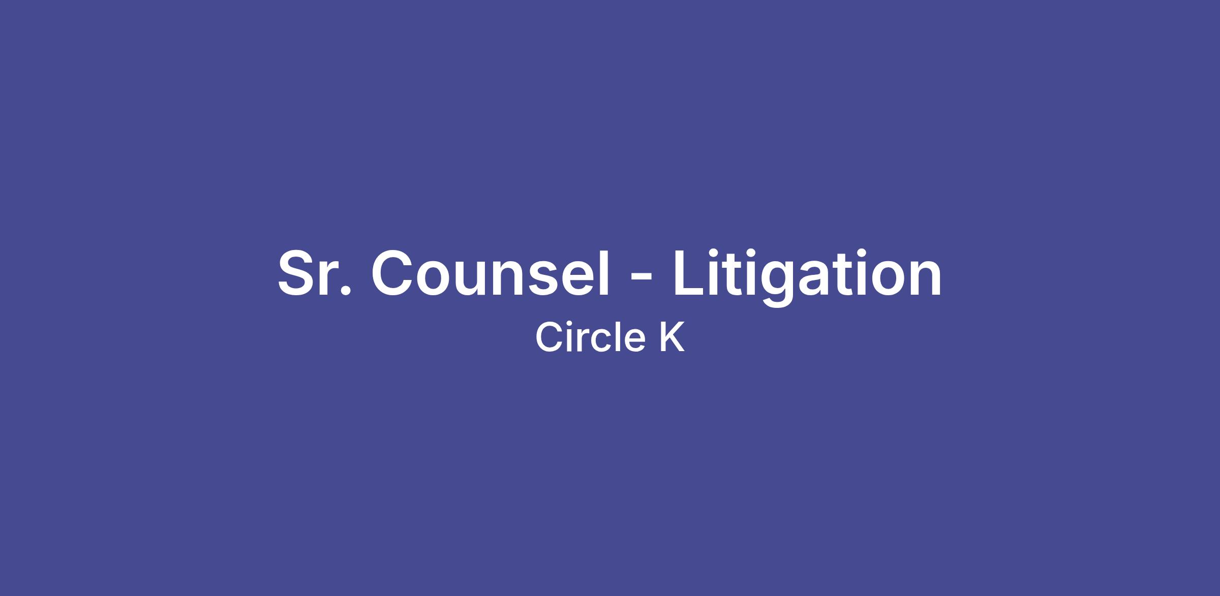 Circle K is seeking a talented Sr. Litigation Counsel to join the U.S. Legal Team reporting to the Director of Litigation - Global. The selected candidate will have discerning judgment and provide legal and administrative support on litigation matters in the U.S. and provide direct management of outside panel. The ideal candidate is determined, self-motivated, organized, detail-oriented, proactive, and committed to assisting us to meet all of the Company’s litigation needs. In addition to the litigation focused role of this position, additional weight will be given to those candidates that have experience in other subjective matter areas such as contract review and negotiation, marketing, procurement and data privacy.