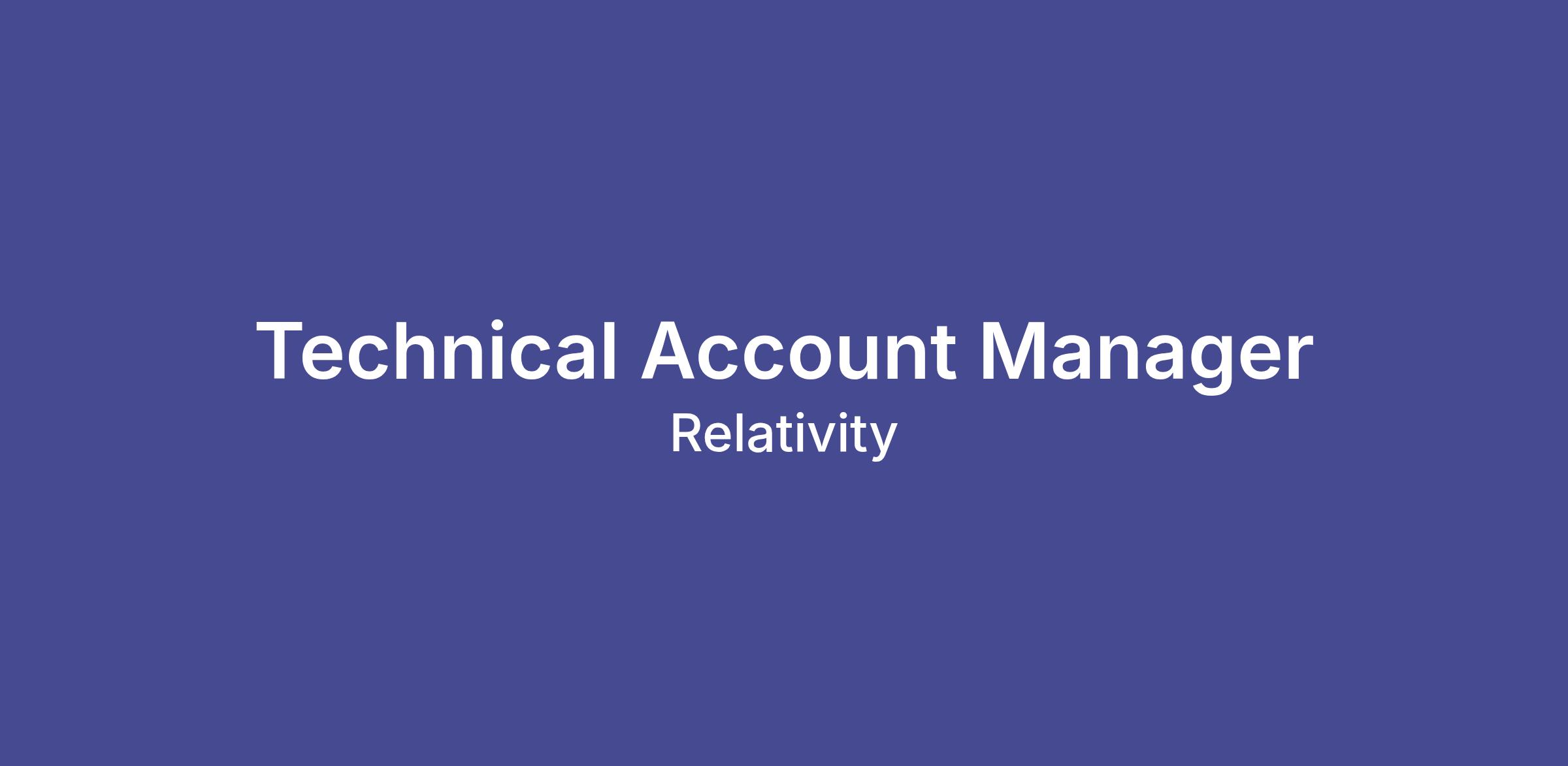 The Technical Account Management (TAM) Team proactively supports our customers in meeting their goals and overcoming any technical challenges encountered using the Relativity suite of products. As a member of the TAM Team, the Technical Account Manager works proactively with our customers to ensure strong outcomes with key customer projects, goals, and KPIs.Job Description and Requirements