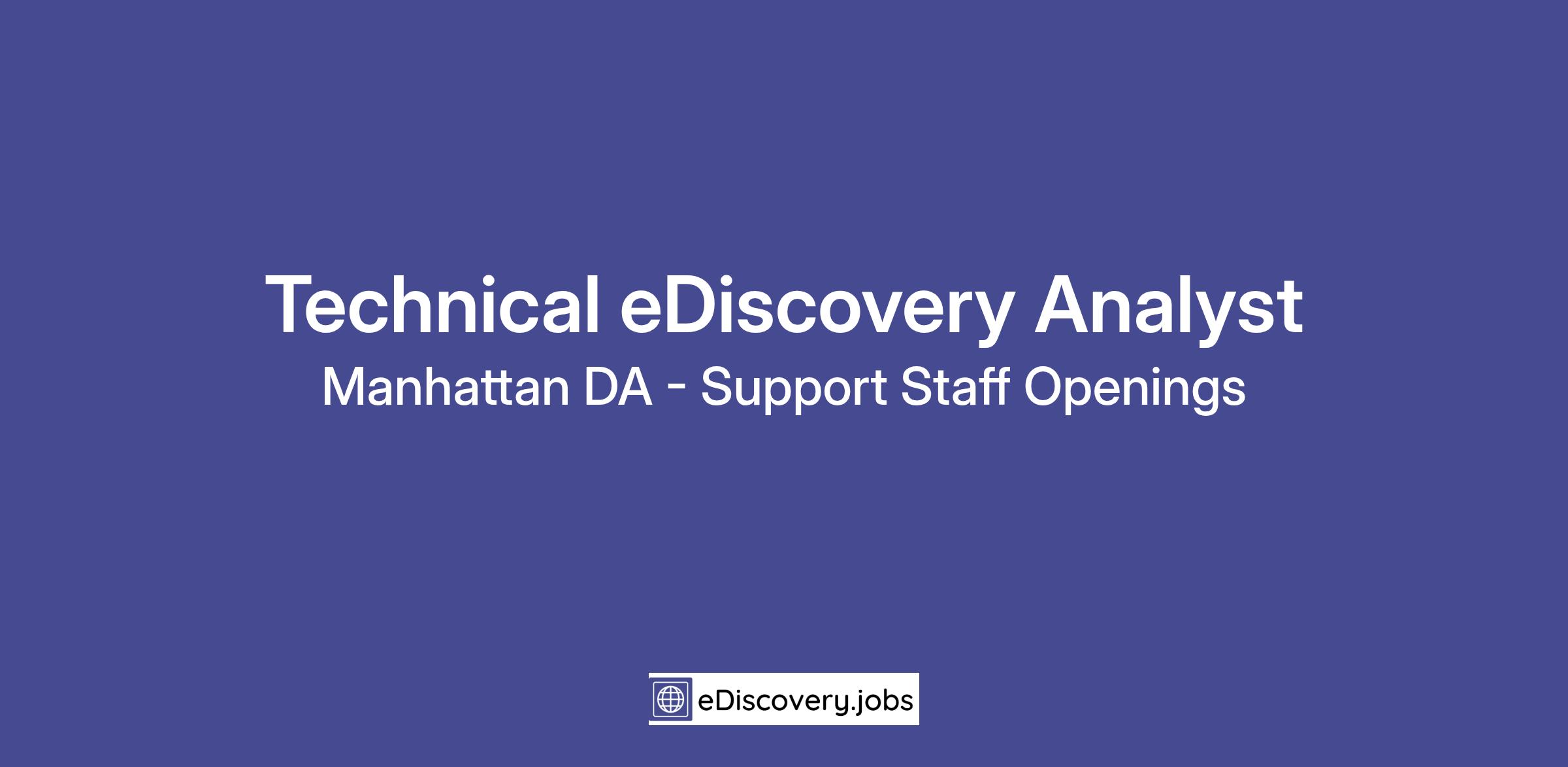 The New York County District Attorney’s Office (DANY) has an immediate opening for a Senior Technical eDiscovery Analyst in its Information Technology (IT) Department. The eDiscovery Analyst will work closely with Senior Managers, Managers, Analysts, Legal Review Attorneys, instructing case teams, and clients as needed. The primary responsibility of Senior eDiscovery Analyst will be executing technical solutions in adherence to best practices, administering our in-house discovery platform, and supporting platforms provided by third-party vendors. Working under the direction of the eDiscovery Manager to identify and understand client needs, assisting with the execution of the recommended technical solutions and supporting with the delivery of an effective solution throughout the life of a matter.